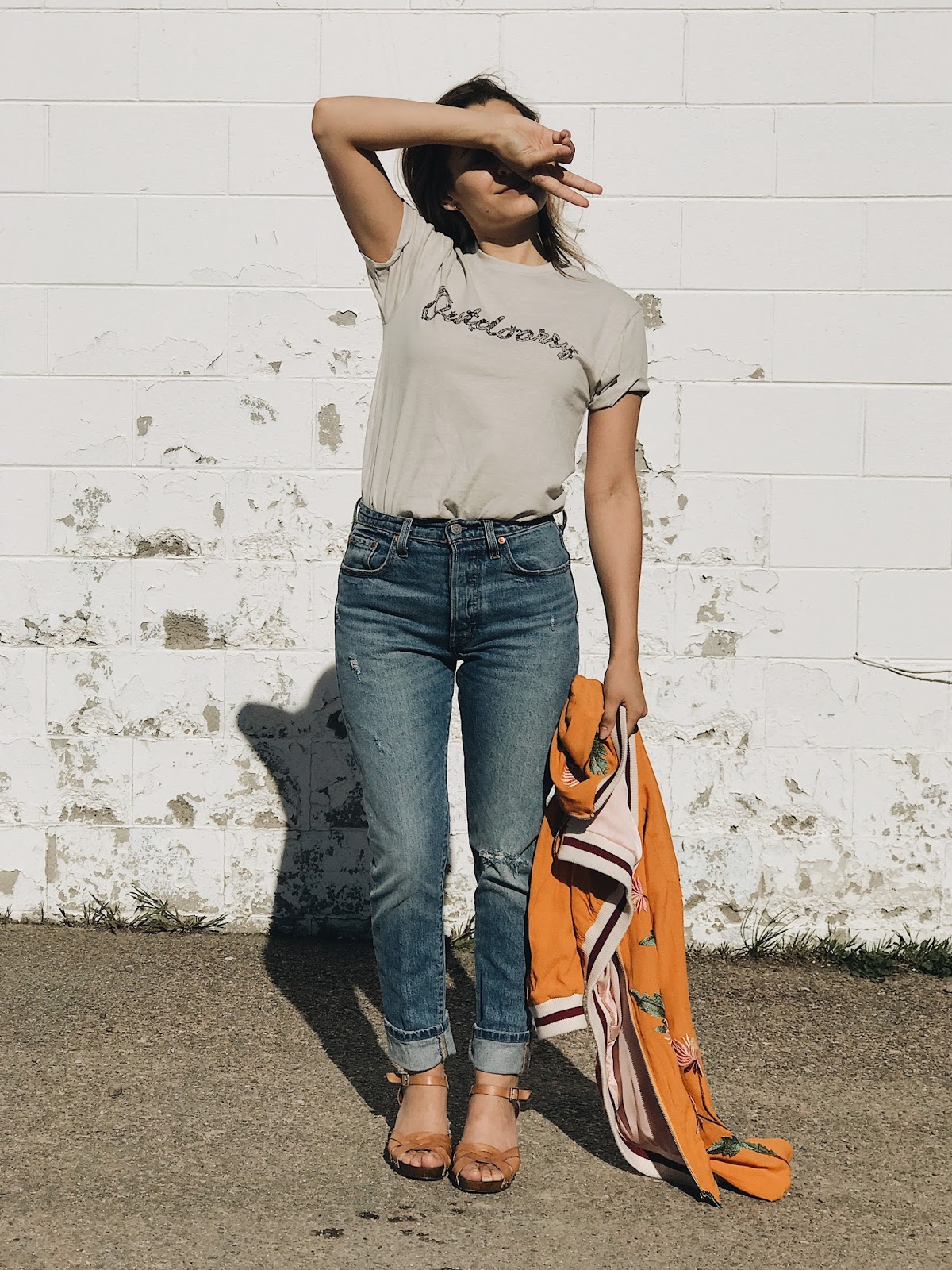 Outfit Details: Jeans- Levi's 501 // Tee c/o- CoLab Print // Clogs- TopShop (old) // Bomber Jacket- Anthropologie